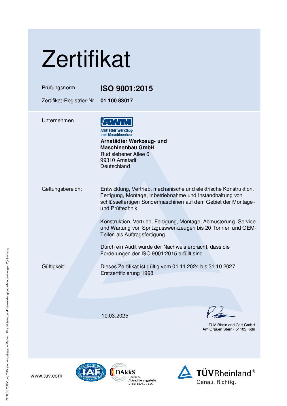 We have been certified in accordance with DIN ISO 9001 by TÜV Rheinland.